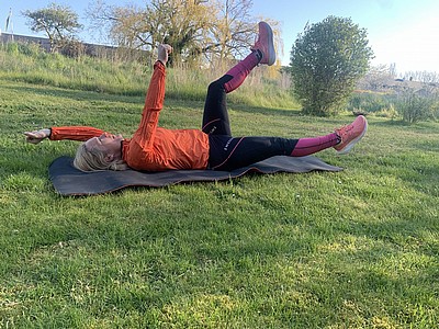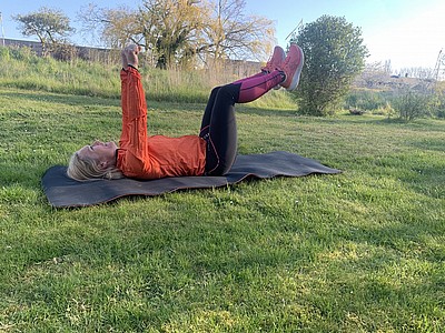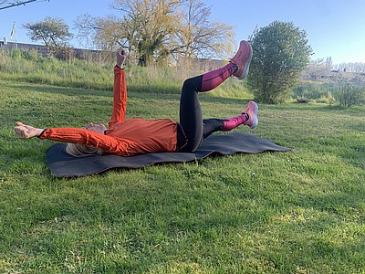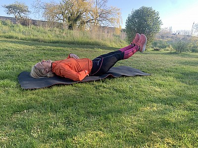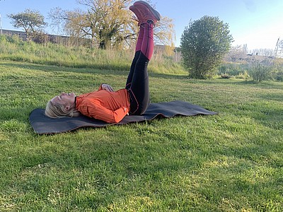Ryggliggande, pressa ner svanken i backen – raka ben, sänk ner från ca 90 graders böjning i höften till 30 grader, upprepa 3*20 st